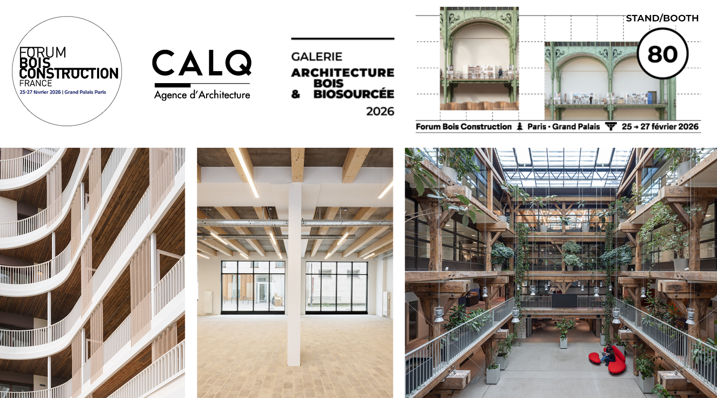 Dans le cadre de la 15e édition du Forum International Bois Construction 2026, CALQ expose à la Galerie de l'Architecture Bois/Biosourcée du XXIe siècle au Grand Palais du 25 au 27 février 2026.