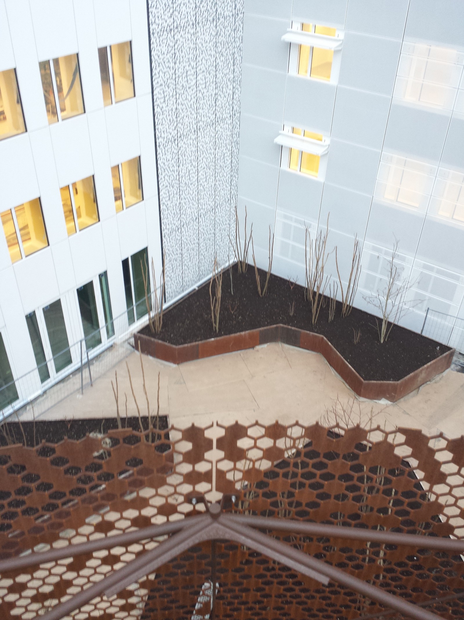 L’agence B. architecture a dessiné des façades habillées de « flaps » mobiles en métal perforé. Le pavillon d’accueil en cœur d’îlot constitue un écrin de verre, à l’intérieur duquel s’élève un escalier en bois ondulant signé Ora ïto.