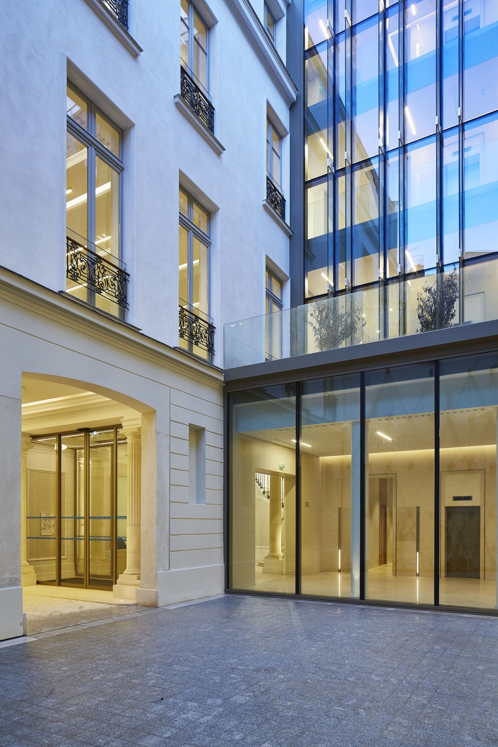 plateaux de bureaux communicants avec l’hôtel particulier. Ainsi, en fond de cour, un nouveau noyau de circulations verticales et de circulations horizontales a permis de relier les plateaux de bureaux côté rue et côté cour. La nouvelle cage d’ascenseurs en duplex permet ainsi de desservir tous les niveaux du nouvel ensemble.